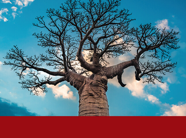 マダガスカルは、年中高温多雨の熱帯雨林気候ですが、いくつかの気候が混在している、過酷な気象条件の国です。 そのマダガスカルには、何世紀もの時を重ねた巨木が並ぶ「バオバブの並木道」という有名な通りがあります。 バオバブの木は、古代から厳しい環境に住む原住民を見守り支え続けてきました。 雨の降らない土地で乾燥に耐え、地面にしっかりと根を下ろすバオバブの木は、「母なる木」と呼ばれ、その生命力の強さで有名で一千年の樹という意味も持っています。