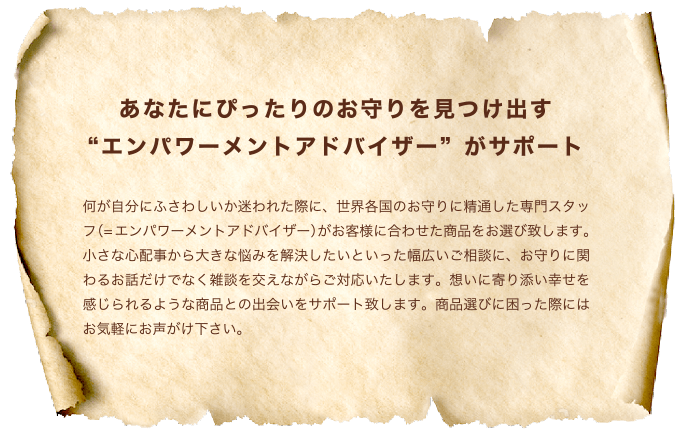 何が自分にふさわしいか迷われた際に、世界各国のお守りに精通した専門スタッフ(=エンパワーメントアドバイザー)がお客様に合わせた商品をお選び致します。小さな心配事から大きな悩みを解決したいといった幅広いご相談に、お守りに関わるお話だけでなく雑談を交えながらご対応いたします。想いに寄り添い幸せを感じられるような商品との出会いをサポート致します。商品選びに困った際にはお気軽にお声がけ下さい。